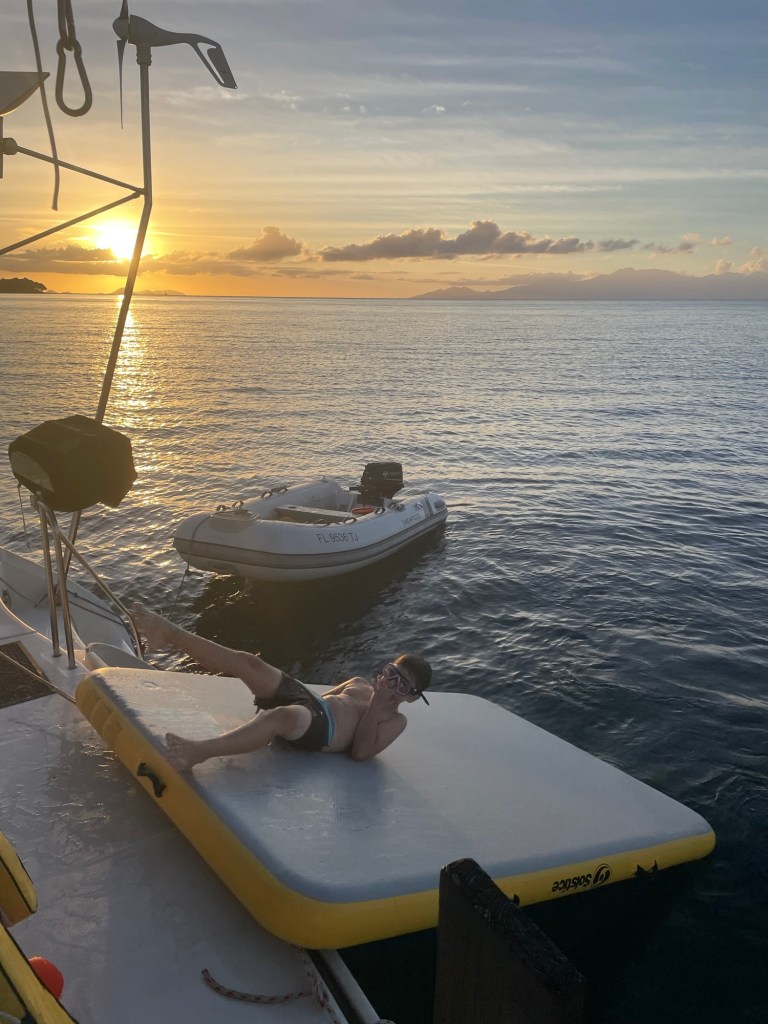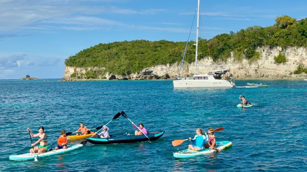 We knew before we even finished our sail that we had made a good decision. The water was Bahamas blue, and the beaches were some of the prettiest we’ve seen, with powdery white sand and lots of big shade trees along the back. We came up alone, but within 24 hours 4 other kid boats that we had met previously descended on our little bay! We spent almost a week there with perfect weather, the kids playing daily on paddle boards and at the beach together. One day they decided to play “Pirates,” which involved all the kids getting on paddleboard and canoes and going around to the different boats anchored in the bay demanding snacks! Neal and I met them with our water cannons (and then cookies)…pirates have to earn their snacks on Zia!